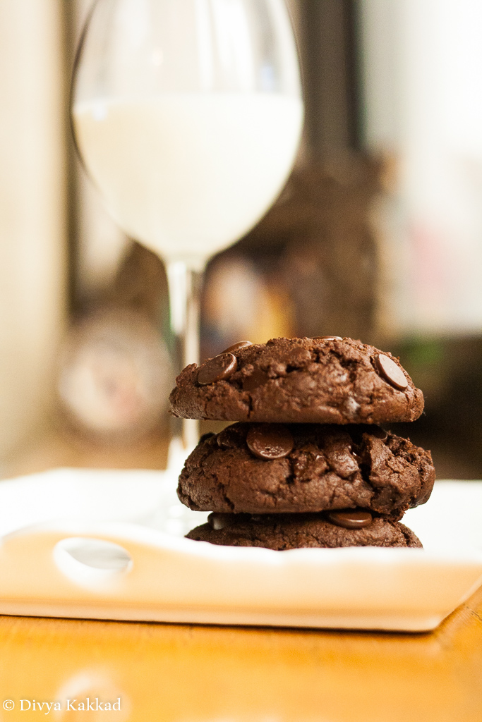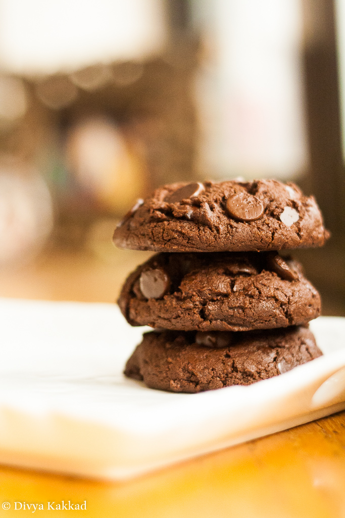 I am lucky that my husband is a foodie and has as much of a sweet tooth as I do! He is a true chocolate lover. Between us, I mostly opt for caramel or fruit dessert and he always goes for chocolate. We both had our first double chocolate chip cookie from Levain Bakery here in New York City when we first moved last summer. Without doubt, it is the best cookie I had ever eaten. I became obsessed with trying to find their recipe and have tried so many versions, always trying a little something different with each try. Their cookies are a cross between a dark chocolate brownie and a crumbly cookie, resulting a dense chocolate cookie that is crisp on the outside but moist and crumbly in the inside. It is truly *deeelish* I think I may have found something that comes close, still not there yet, but its a good enough copy =). This recipe is a tweaked version of one that I learned at a baking workshop conducted by one of my favorite bloggers purplefoodie. I hope they turn out well for you too in your kitchen!