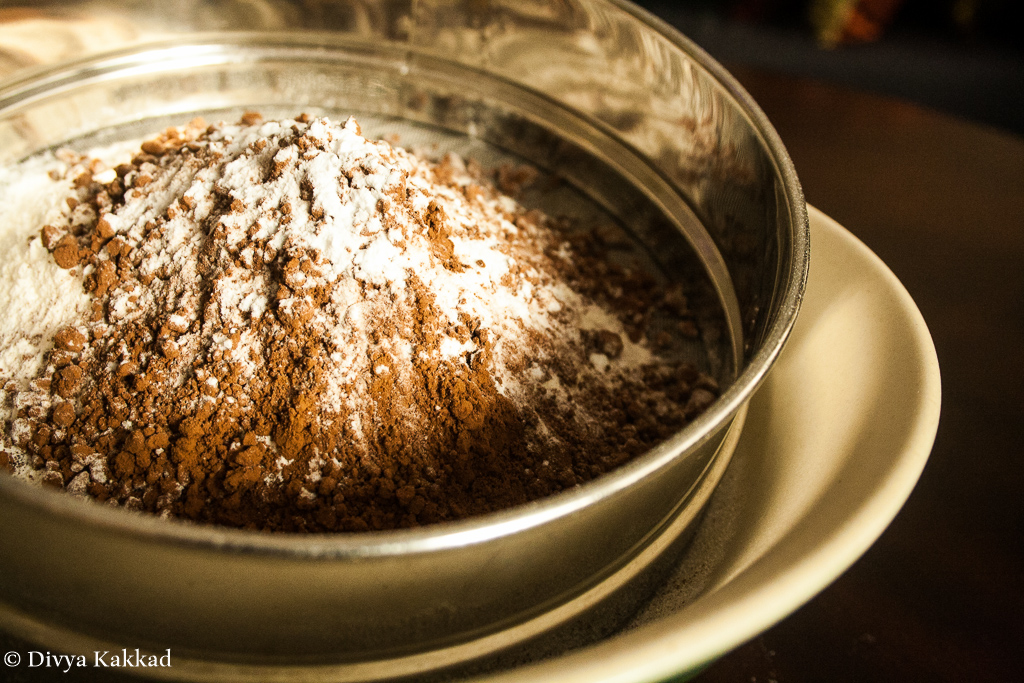3) Sieve and whisk the flour, cocoa and baking soda together in a bowl.