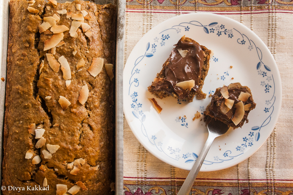 In the spirit of having run a race, being healthy and trying to be a bit more aware of what we put into our bodies, I came up with this recipe which is an adaptation of the many banana bread recipes I have tried in the past by combining stuff that we had lying at home and substituting whatever I could with healthier options. It turned out to be nice and flavorful (more moist the next day) and went well with tea. The toasted coconut flakes added the perfect touch. If you find it too dry (read: too healthy) then slather it with some Nutella to turn it into a decadent dessert. As the picture suggests, we tried that too. Deelish. Enjoy!